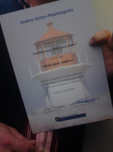 Unser Projekt Mahl ganz anders wurde am 26.April 2012 vom Verein Andere Zeiten mit dem 2. Missionspreis ausgezeichnet. Vor fast genau einem Jahr haben wir das Bild von Leonardo da Vinci in Theaterform auf die Straße gebracht. Mit vielen Passanten kamen wir über das Abendmahl ins Gespräch und außerdem wurden Hintergründe, Gedanken, Bilder und Filme auf http://mahlganzanders.de/ veröffentlicht. Die Bewegtbilder stammen natürlich von mir. Der Preis freut uns, ehrt unser Engagement und wir denken über ein neues Projekt nach.